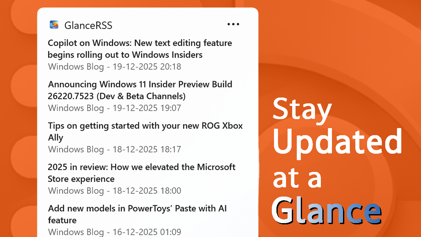 Stay informed at a glance with a customizable RSS reader widget built specifically for the Windows 11 Widgets Board. GlanceRSS surfaces headlines, summaries, and fresh content from your favorite sources without launching a browser—clean, fast, and integrated with the Windows 11 design language.